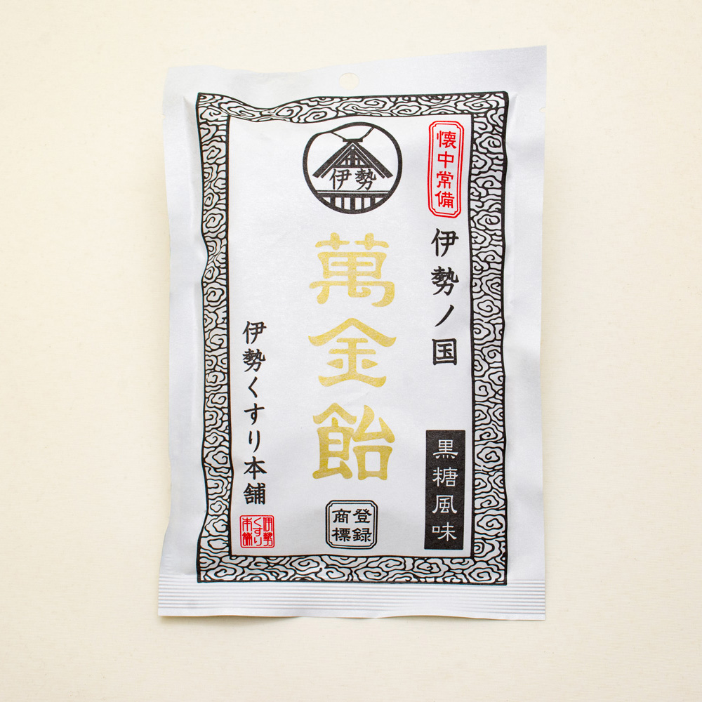 伊勢国朝熊岳萬金飴は、沖縄の黒糖に600年の歴史がある伝統薬「萬金丹」に含まれる3種類の和漢植物(阿仙薬、甘草、桂皮)を配合した、のどとおなかに役立つ、風味豊かな黒飴です。